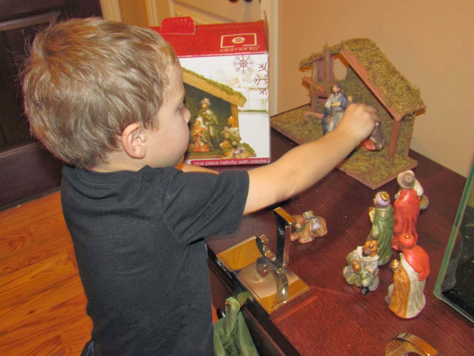 Ben set out the nativity scene all by himself this year and he did pretty good getting everything in the correct place. The only hiccup was that he wanted to put baby Jesus on the roof.