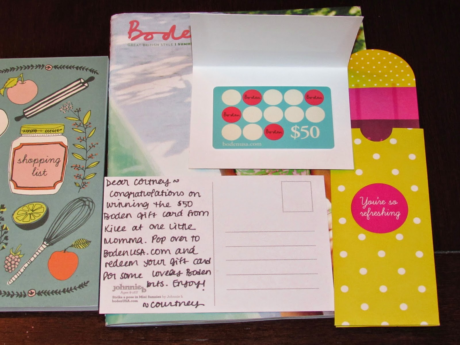 I won a $50 Boden gift card from Kilee over at One Little Momma. The gift card came in adorable wrapping with a little shopping list pad and some seeds to plant. What a great giveaway!