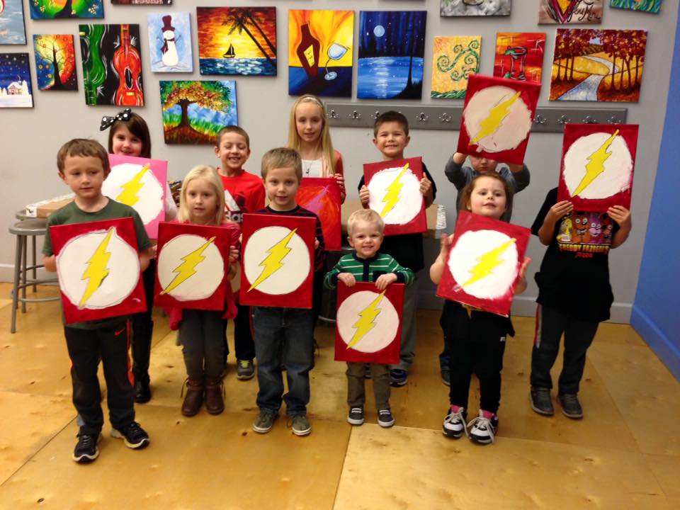 Ben’s really into art so we decided to try out a canvas painting place in our town. These types of places are pretty popular right now and considering they provide everything and clean up, it was well worth the cost. The kids painted The Flash symbol, and ate pizza and cake before Ben tore threw the presents.