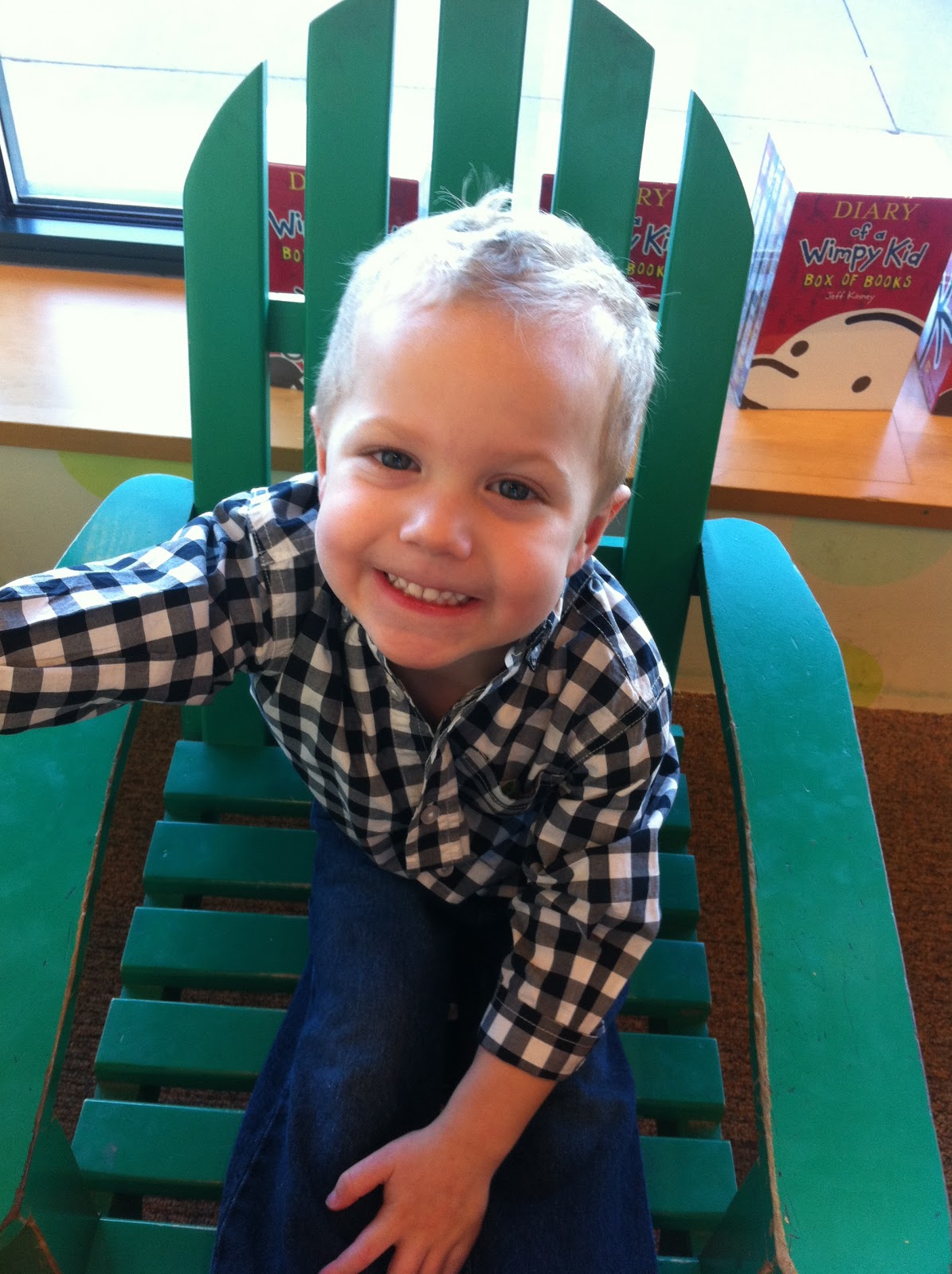So excited for story time. But, I think it made his day when he realized they had a Thomas track to play with.