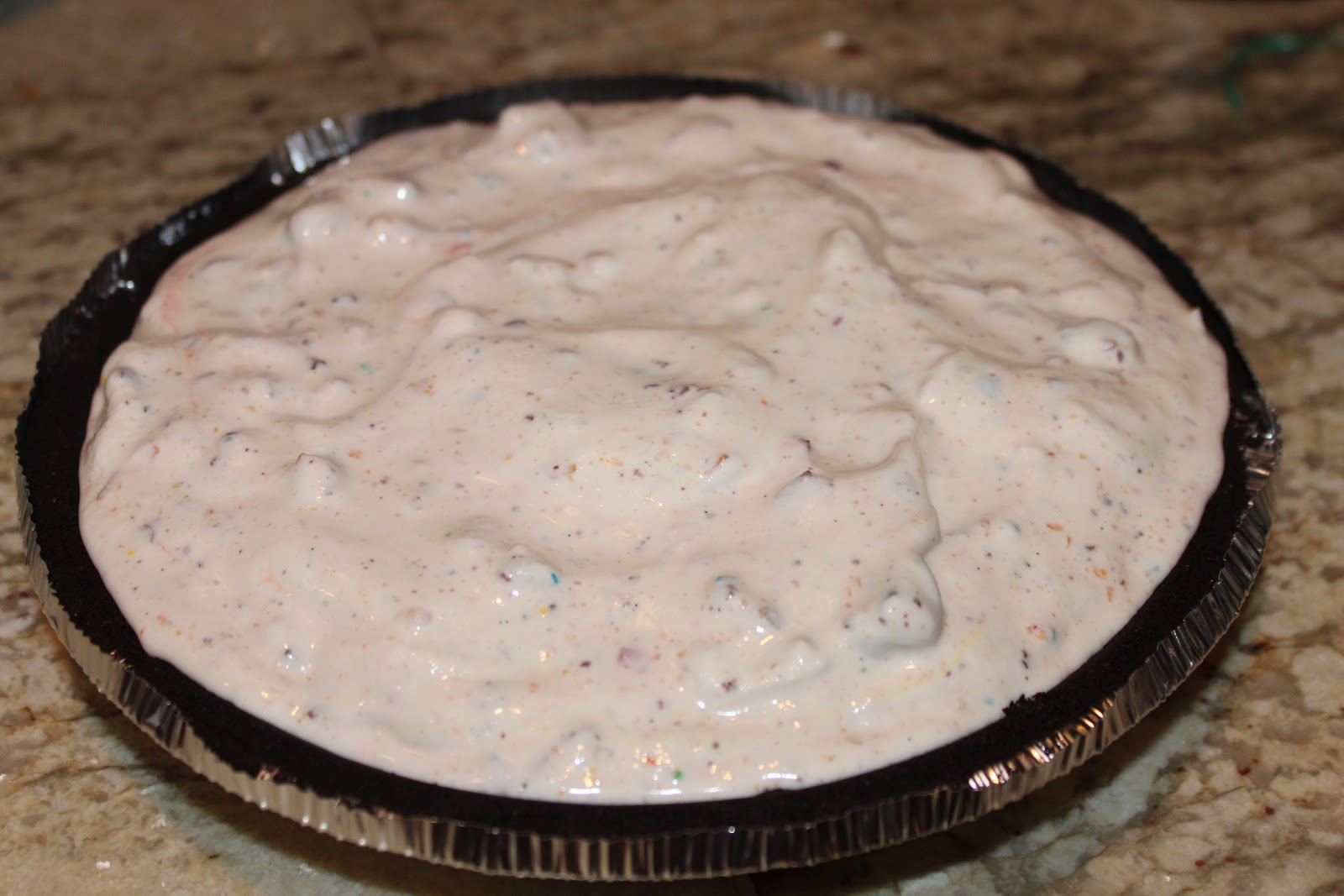 4. Pour the mixture into the Oreo crust. Make sure to leave room about 1/2 inch so you can add the lid back on. I filled mine too full and some of the ice cream leaked out of the lid.