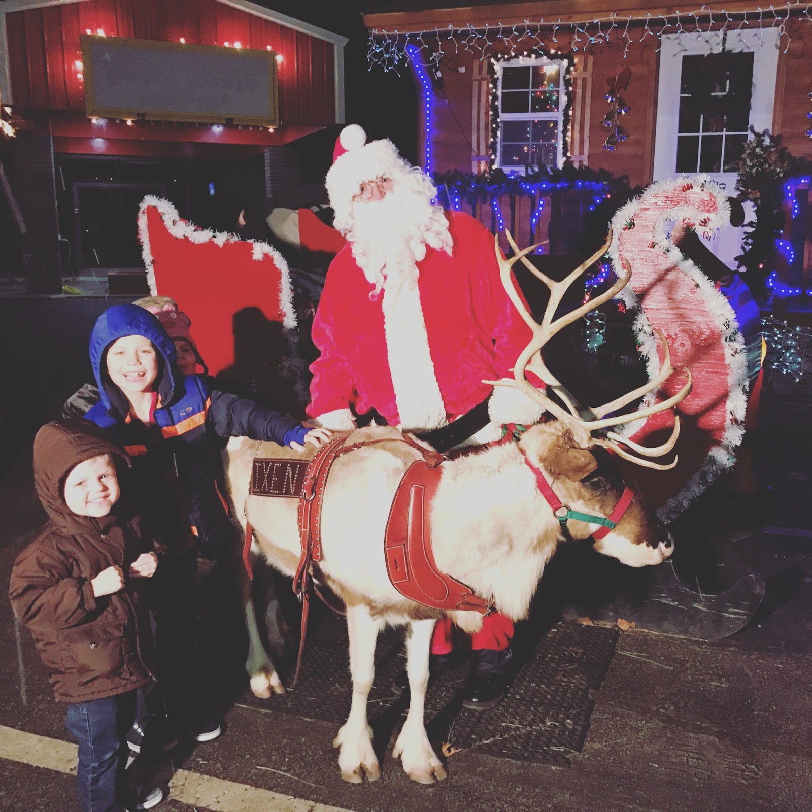 By the time we got checked in and unpacked it was already dark so we headed out to The Shepard of the Hills to see The Trail of Lights. We were so sad when we got there and they were closed due to weather 🙁 We made the best of it and went to another drive thru light display and while driving back to the hotel we just happened to run into Santa himself and his trusty reindeer Vixen.