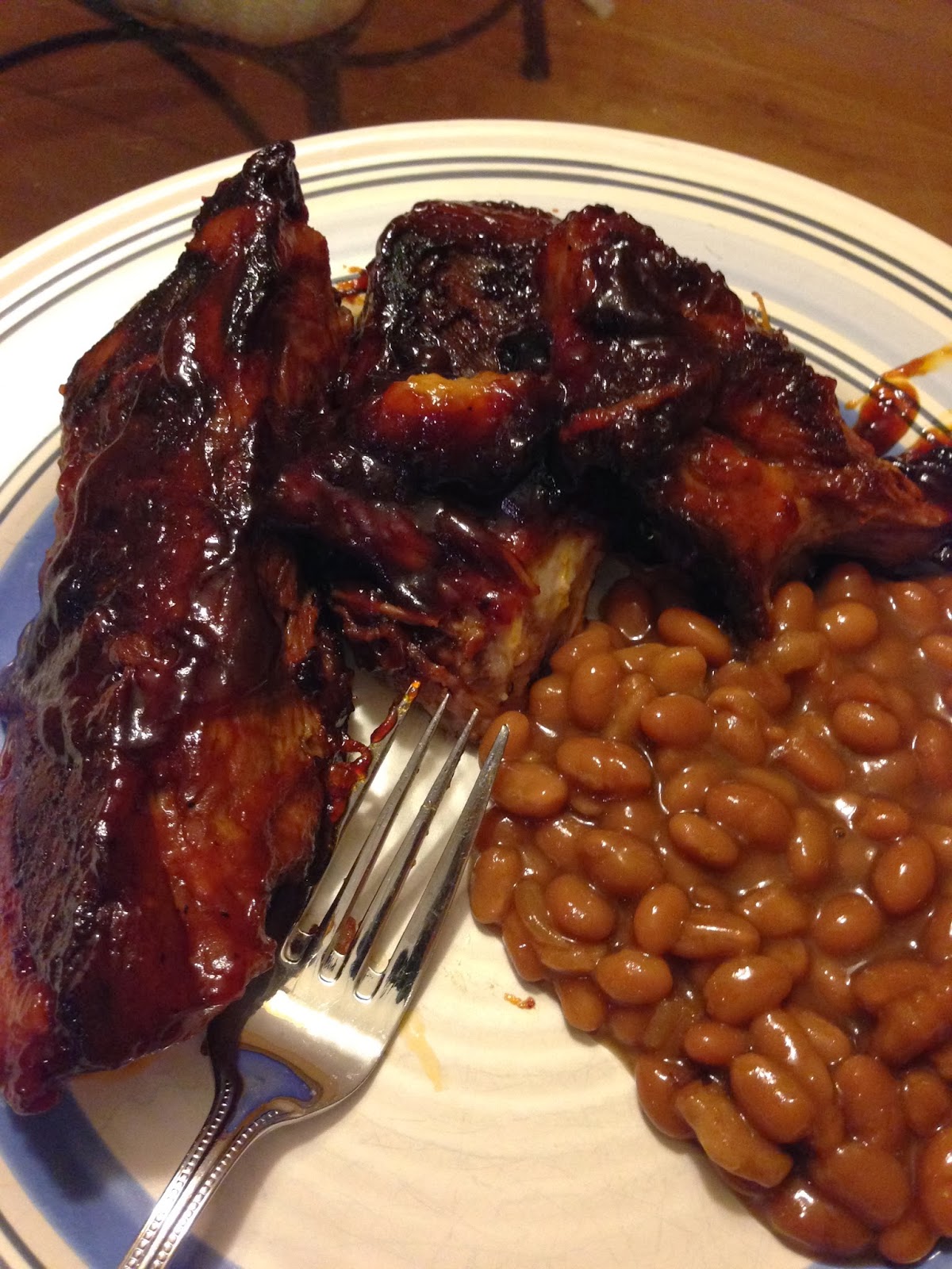 6:00pm: We’re back home and J entertains the boys while I get dinner ready. This night we had ribs that I had prepared the day before and J just had to throw them in the oven. I also heat up a can of baked beans, make a quick salad, and get the oranges and pineapple out of the fridge.