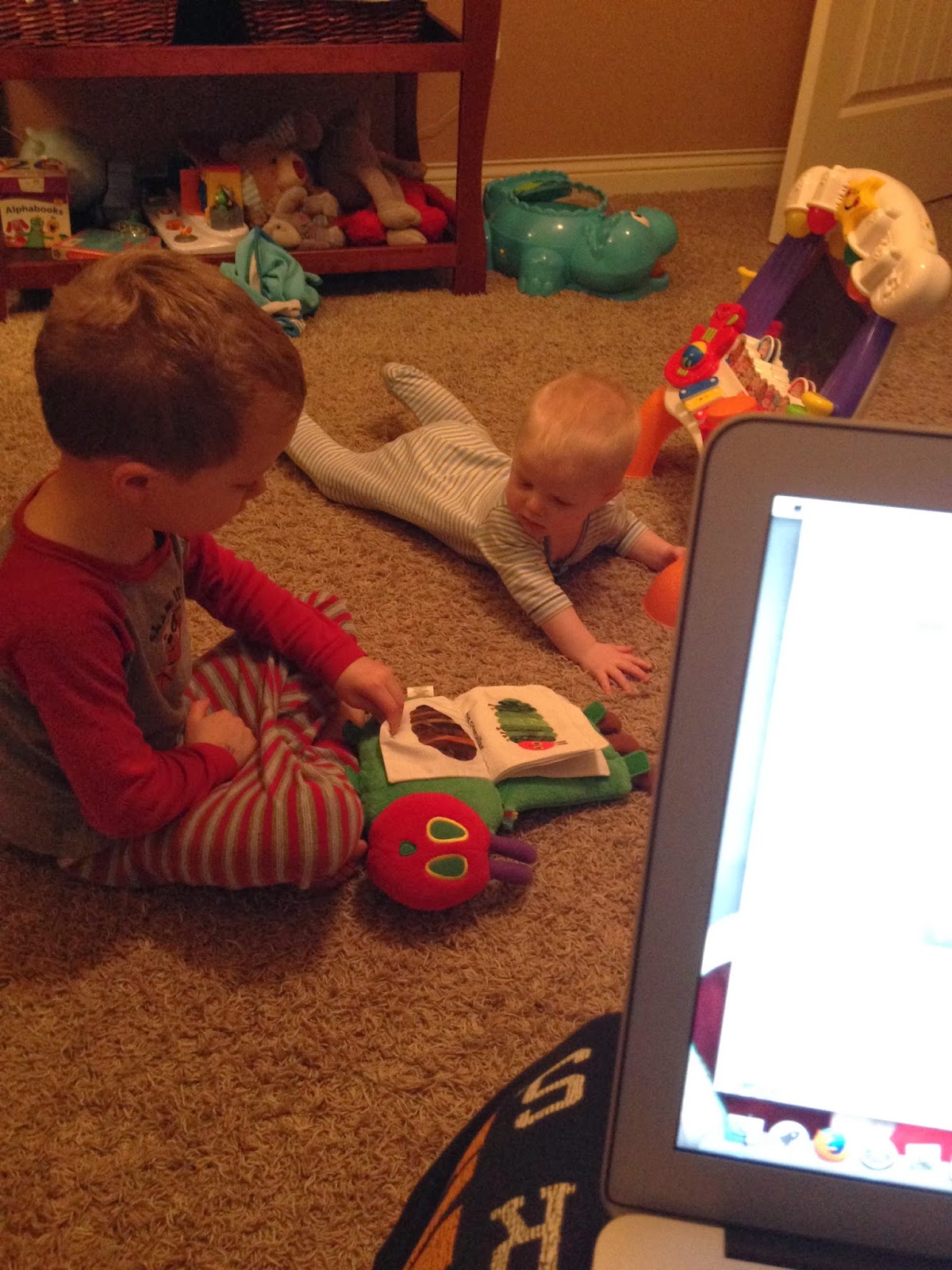7:10am: The boys finish eating, Jack gets a quick wipe down, and then we go into Jack’s room where the boys for a little bit. Ben reads Jack a book while I respond to some work emails since I will be traveling for clients and won’t have a chance to later.