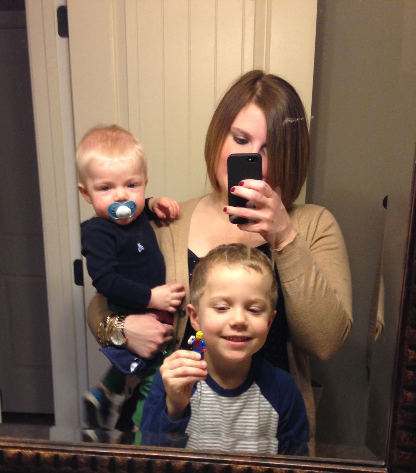 7:55am: We’re all dressed and ready to go. We take one last picture in which Ben demands his Lego be in, before we head out the door.