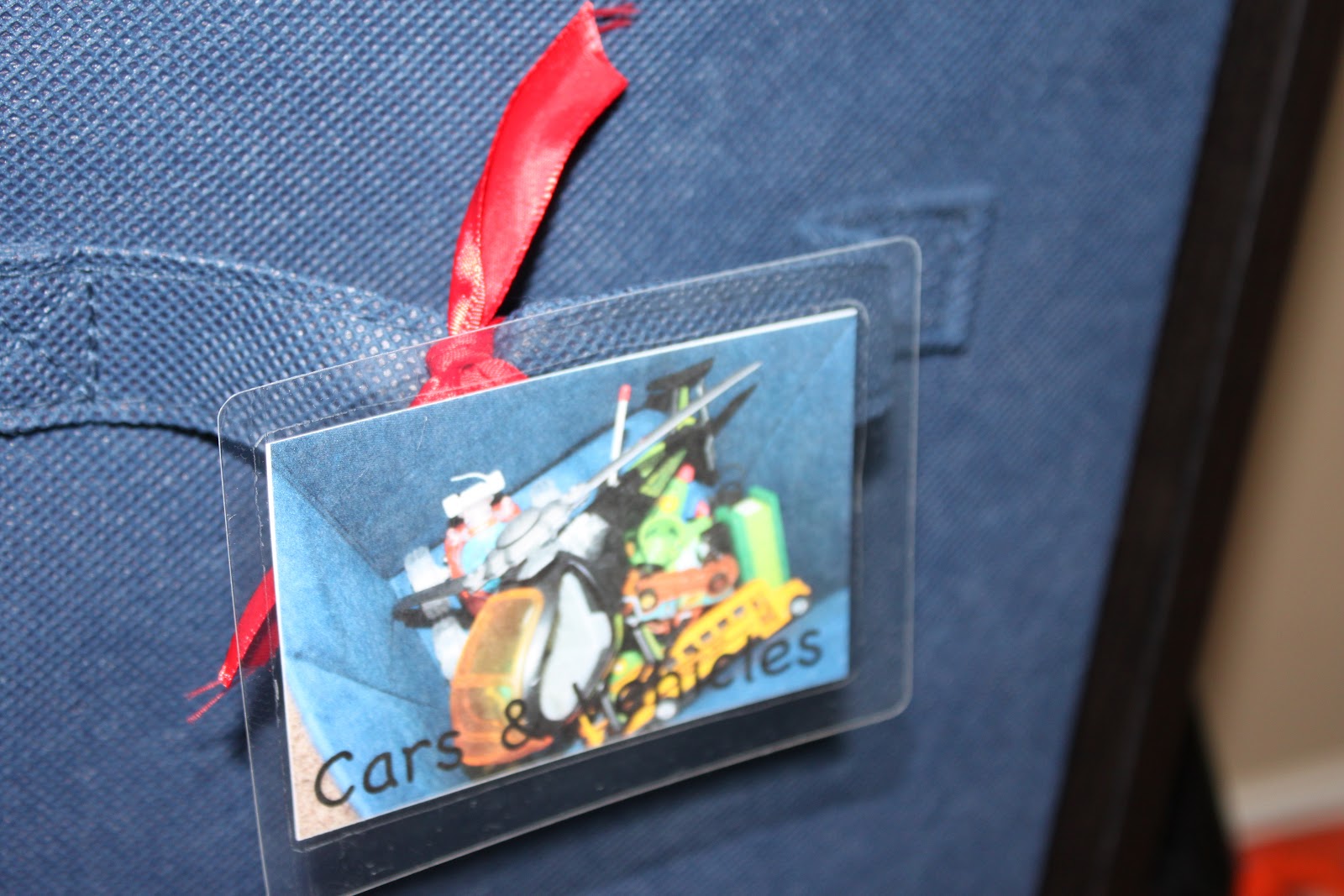 Once the pictures were laminated, I busted out the hot glue gun and glued ribbon in a V pattern to the back. The V pattern allows you to tie the label on the bin.