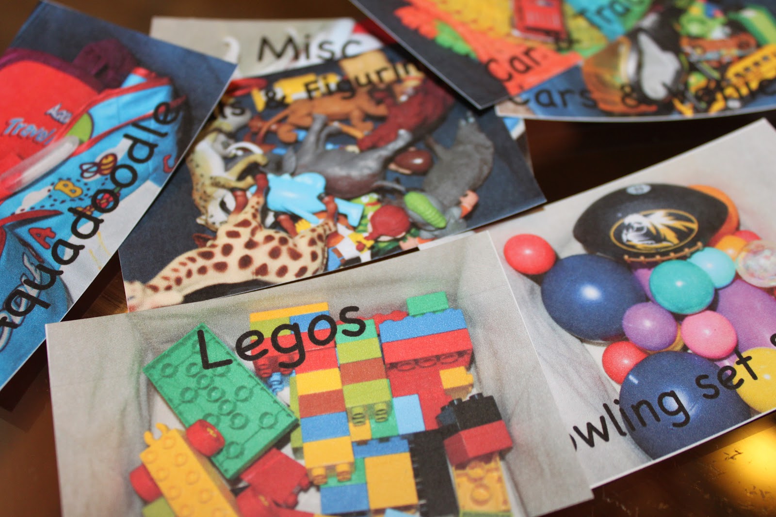 The first step was to purge and organize so that everything had a distinct home. Once all the toys were separated by bins, I took pictures of what was inside of each one. Pictures are great for younger kids who can’t read yet. I also labeled each picture for the adults, who might happen to help with clean up also:) I printed them out on heavy card stock and used a paper cutter to get straight even lines.