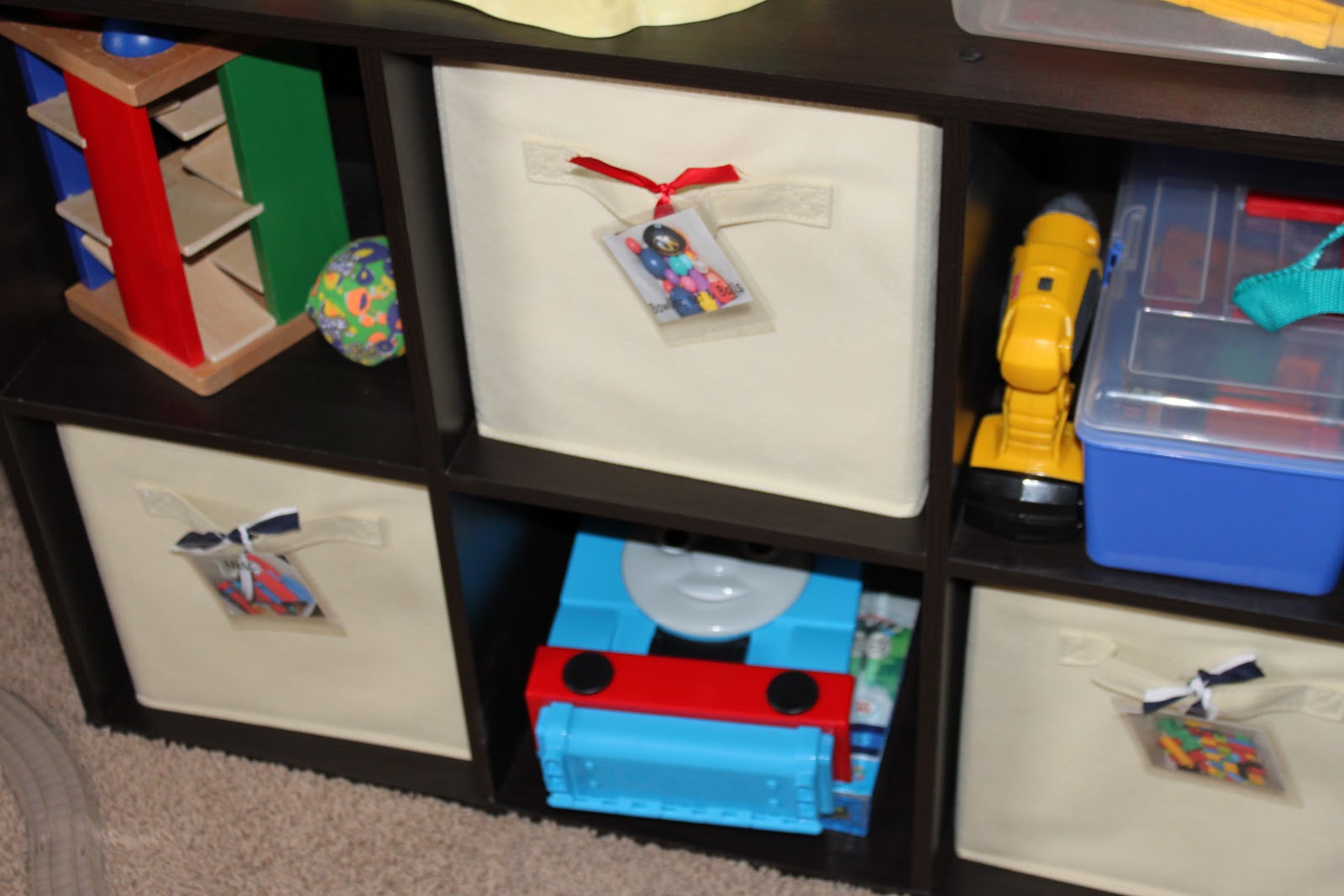 Now that Ben’s 3, we’re giving him more responsibilities such as putting away his shoes, hanging up his coat, clearing his plate, etc. I found cleaning up the playroom to be a challenge because there was no organization what so ever. Wherever it would fit it went which led to disorganization. I also found that he wasn’t really playing with all of his toys because he had no way to see exactly what his choices were.