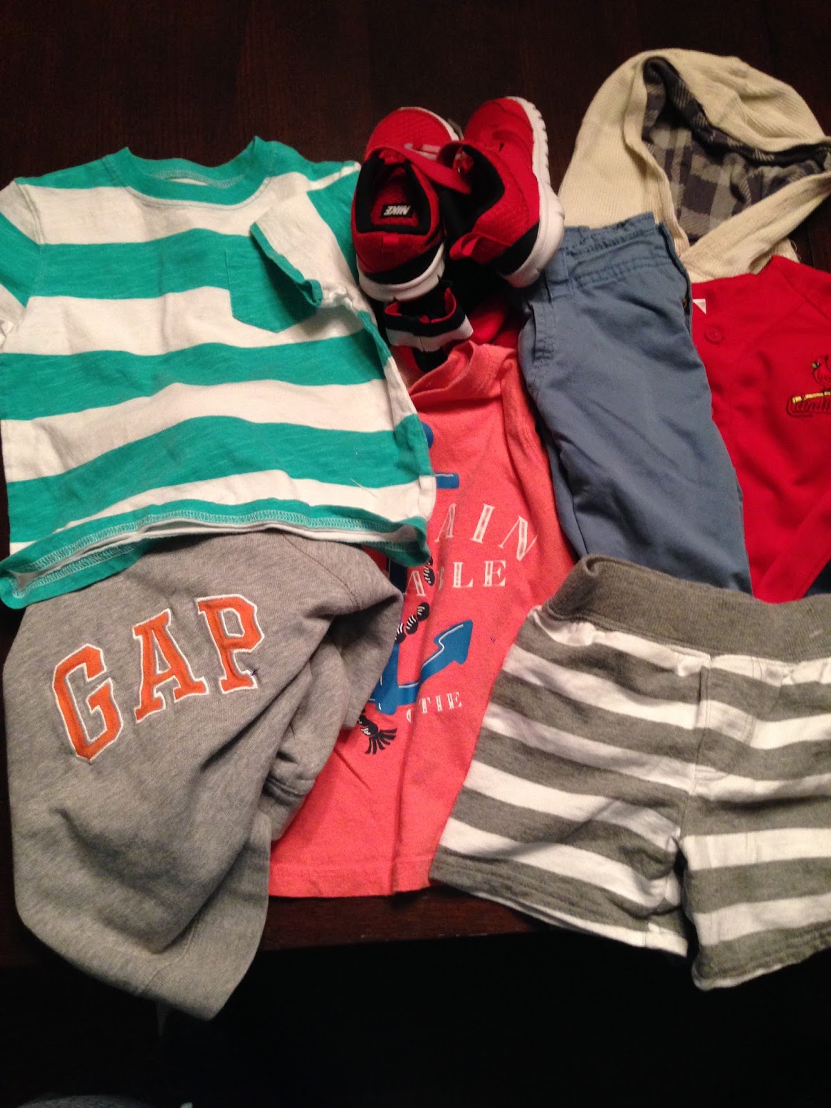 Speaking of finds, I got to pre-shop a local consignment sale last night and scored all of these goodies (plus some books and a toy not pictured) for $30. Including that almost brand new pair of Nike’s for Jack.
