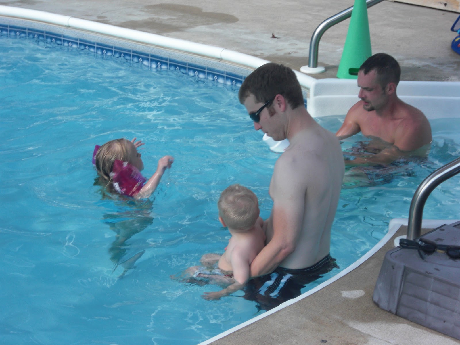 While Ben napped we all played the DVD version of Family Feud and I’m sad to say my parents beat us. When Ben woke up we loaded up the car and headed to see J’s family. One thing I really love about J’s family is that they all get together whenever possible usually at his aunt’s house. All my family lived far away from each other so we never really got to hang out a lot when we were all growing up. I love that Ben will get to grow up with all his cousins around. We all met at J’s Aunt’s house. They have a pool and hot tub so we bbq’d and swam until it got dark. There are tons of kids and it’s so fun to spend quality time with everyone.