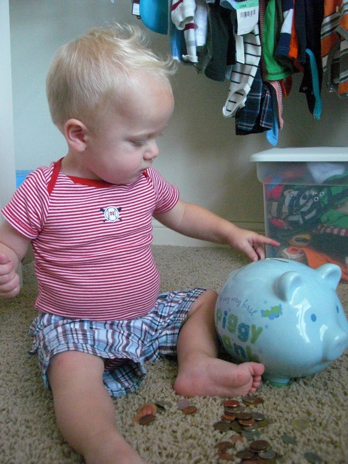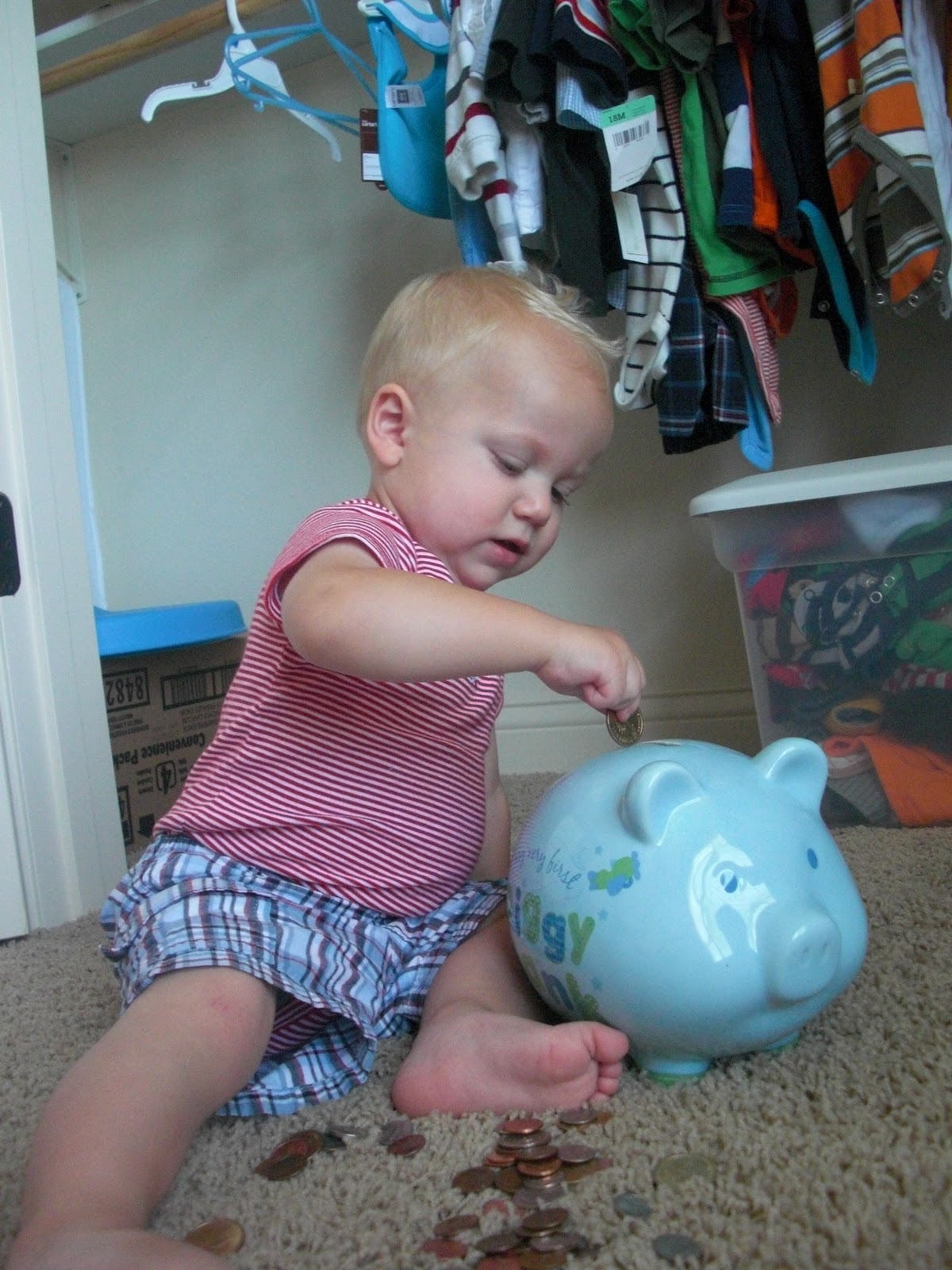 One tradition that J’s grandma does every Easter is that she hides gold dollars in the Easter eggs for all the kids instead of candy. Last year Ben was too little to collect eggs, but this year he was all about finding the “gold.” The other day he wanted his piggy bank down and we got out all the change. J would tell him, “bring me your gold,” and Ben would go over and hand it to him and then snatch it right back.