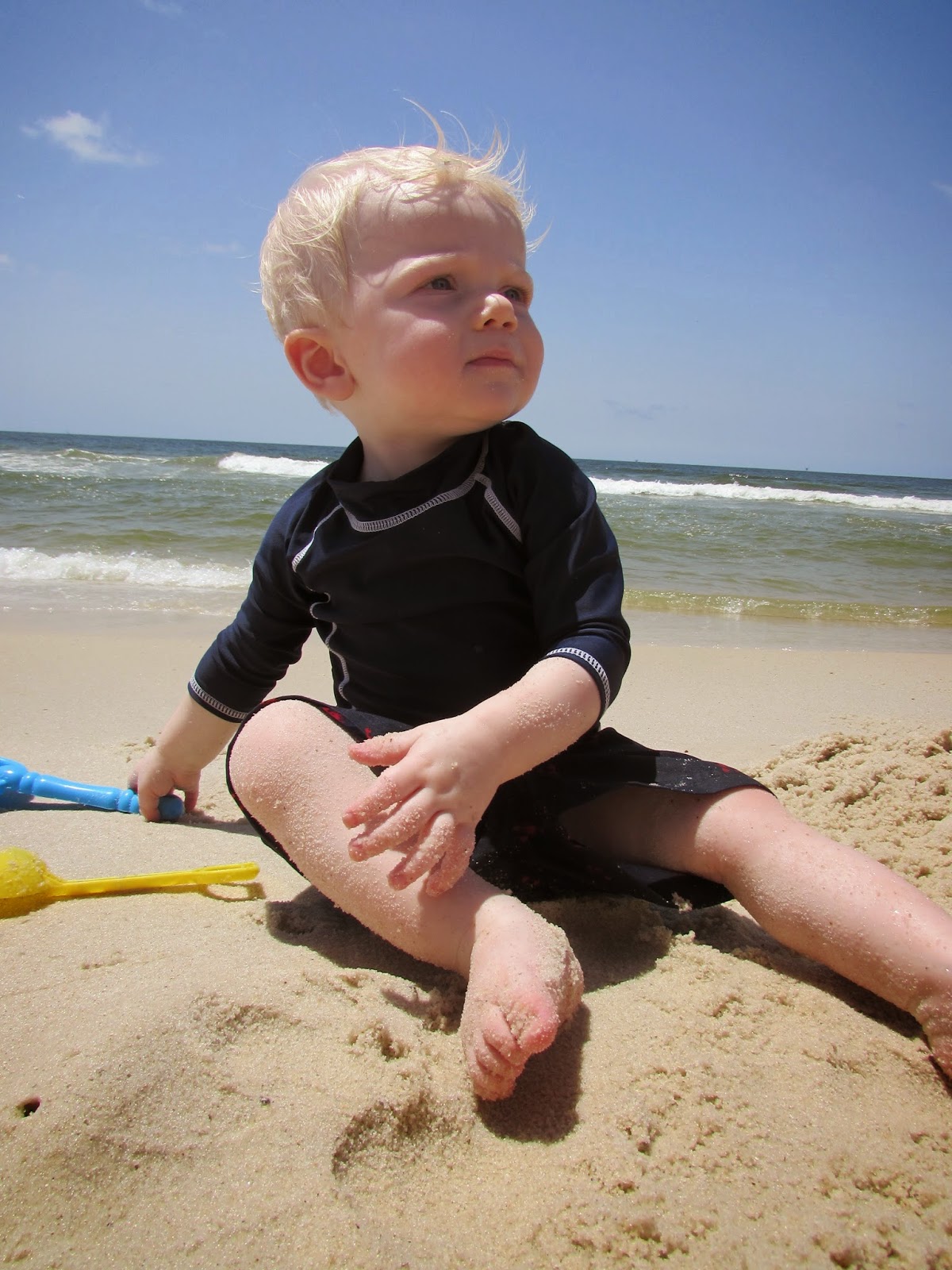 My parents and sister left later than we did so while we waited for them we took the boys down to the beach for the first time. Jack grabbed the toys and plopped himself down in the sand.