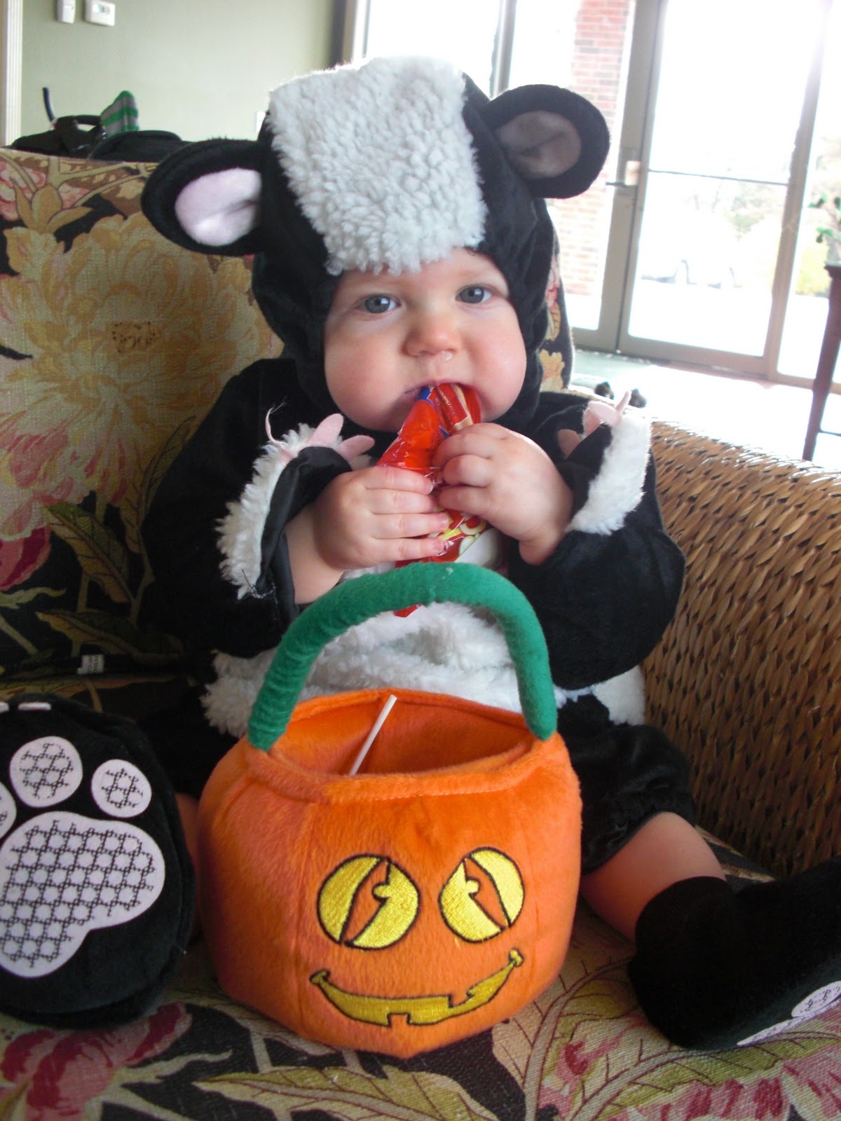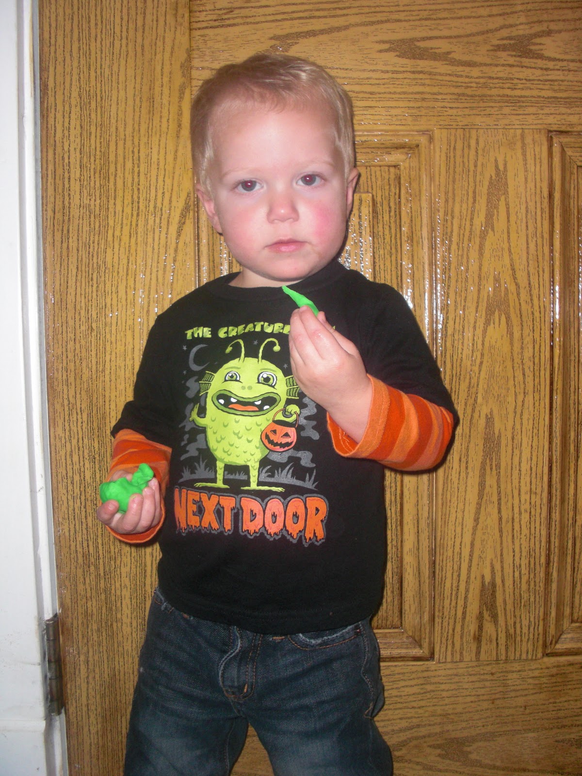 Like most holidays, Halloween was split between both J’s parents and mine. That afternoon we went to J’s parents house to see his brother, aunt and uncle, grandparents, and cousins. I love that all of J’s family live so close and that we get to see them so often. My MIL made chili and Ben got several pumpkins full of goodies including his favorite, Playdough. While fun to play with, Ben really likes to eat it.
