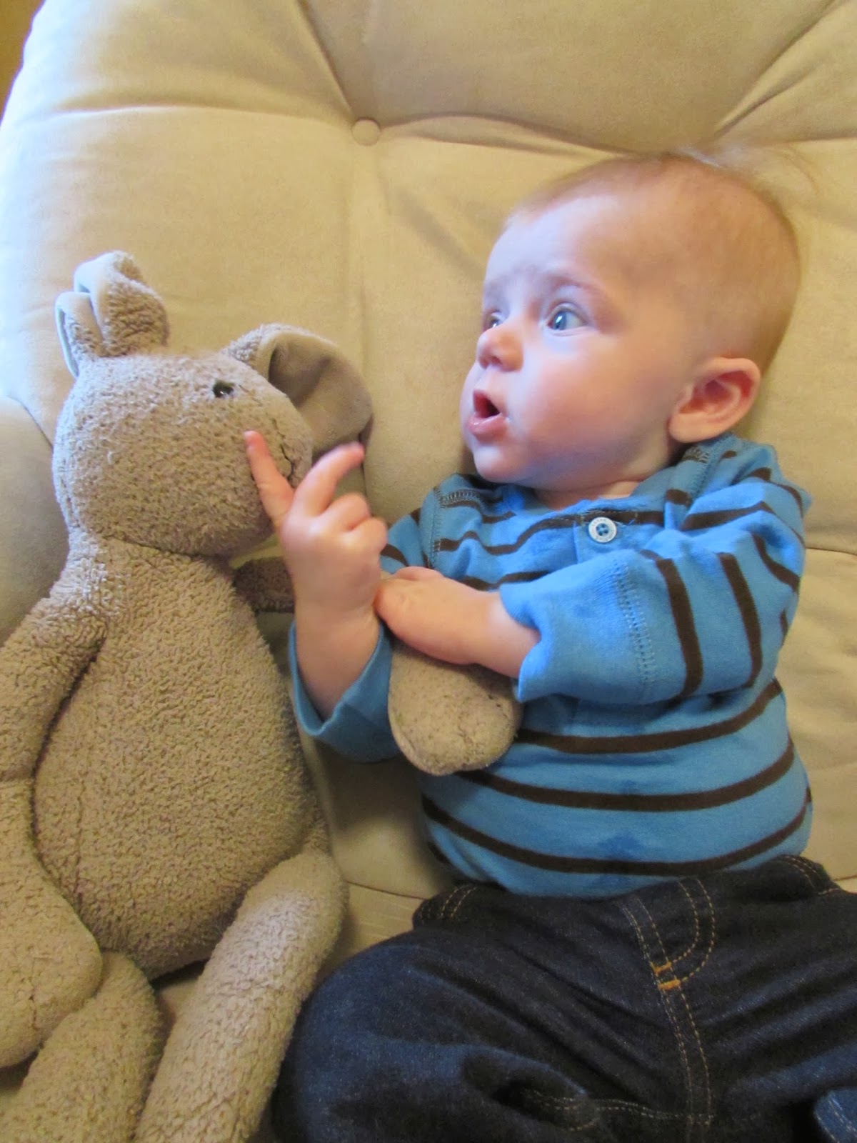 Everything is going in your mouth these days. Your hands, toys, my hair, whatever you can grab ahold of. Your brother’s first tooth came in about at this age and I wonder if yours is going to pop through at any moment.