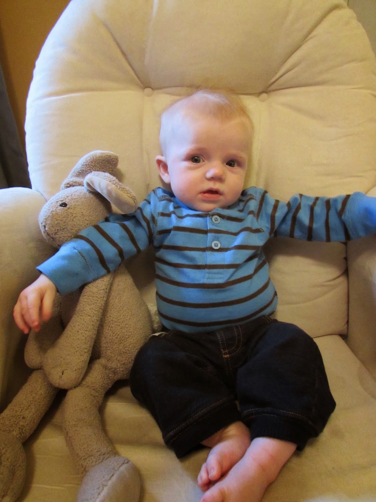 You are taking 6oz bottles and eat every 3-4 hours. Every once in awhile you will go 4-5 hours in between feedings. We started rice cereal this month and you love it! You start to grunt if I don’t shovel it in your mouth fast enough and you like it pretty thick. We are starting veggies tonight and I have no doubt that you will love them as well. You’ve become very aware of when others are eating and I’ve seen you give the stink eye a few times when someone doesn’t offer you a bite.