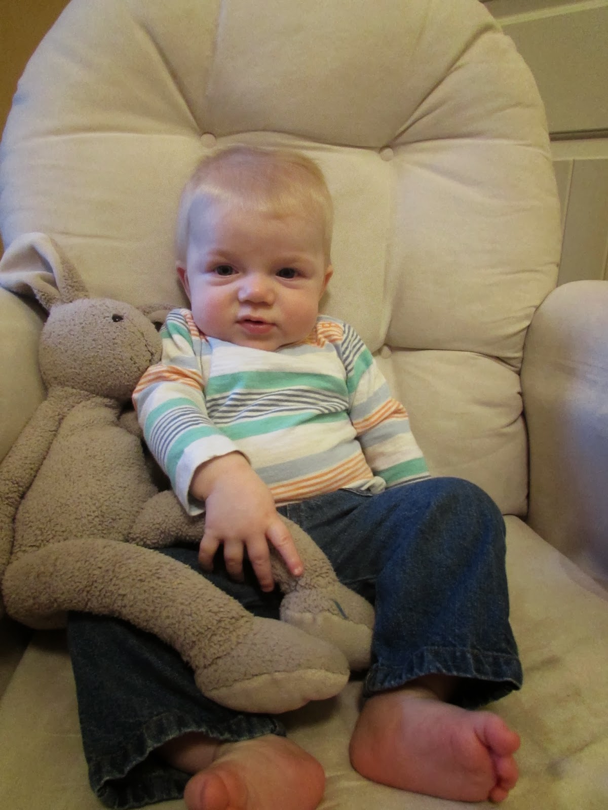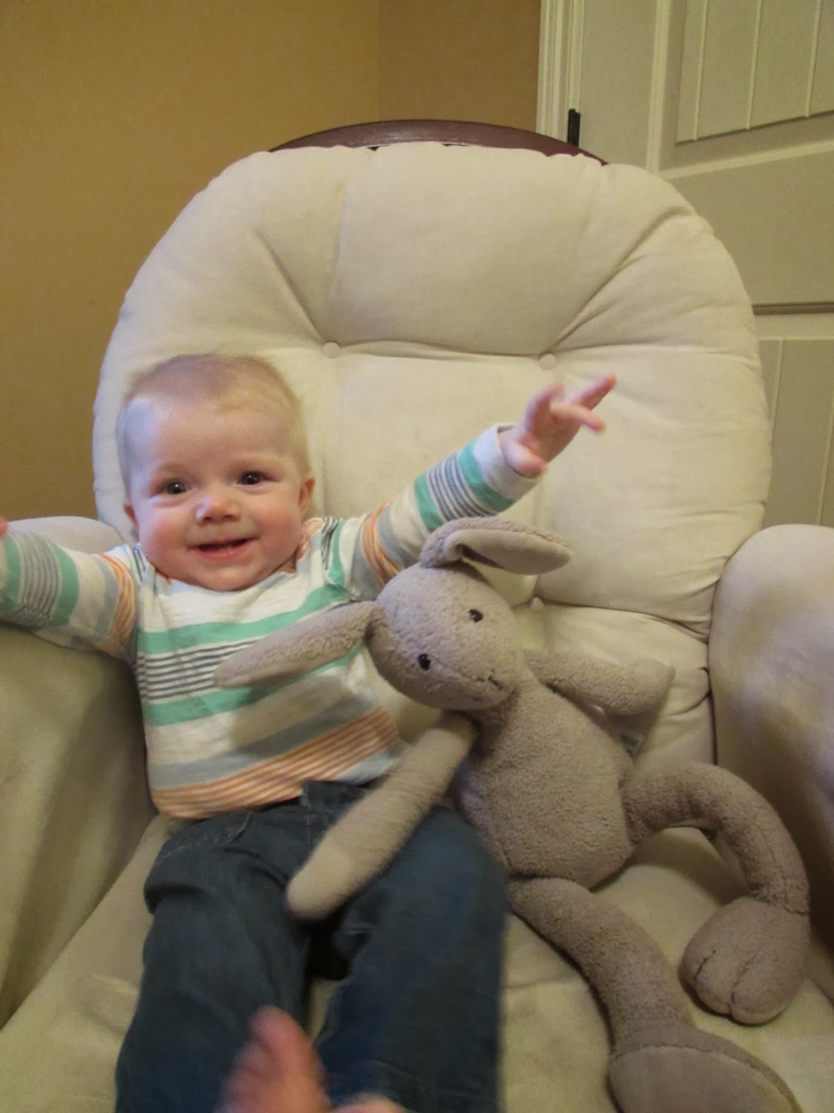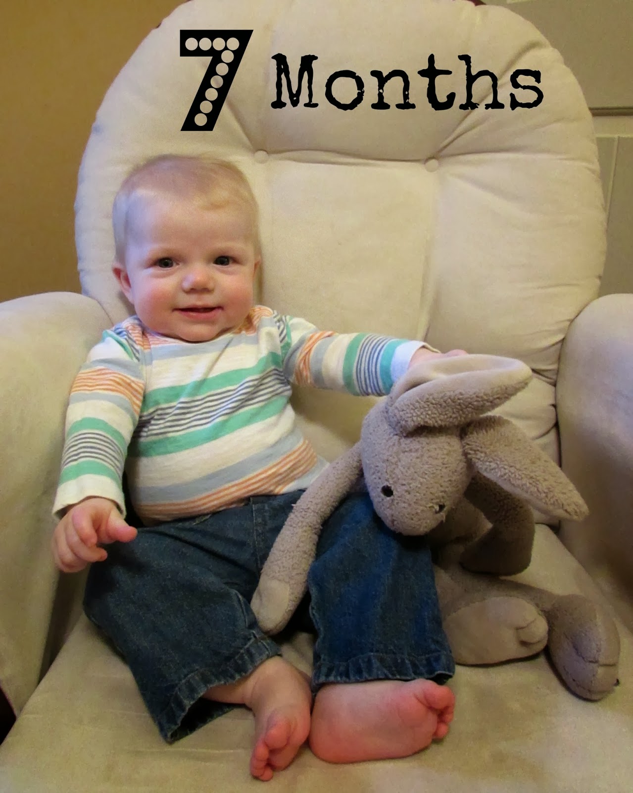 Just like last month, these monthly photos are getting harder and harder to take as you are constantly trying to grab the camera. And this month you want to crawl right off the chair.