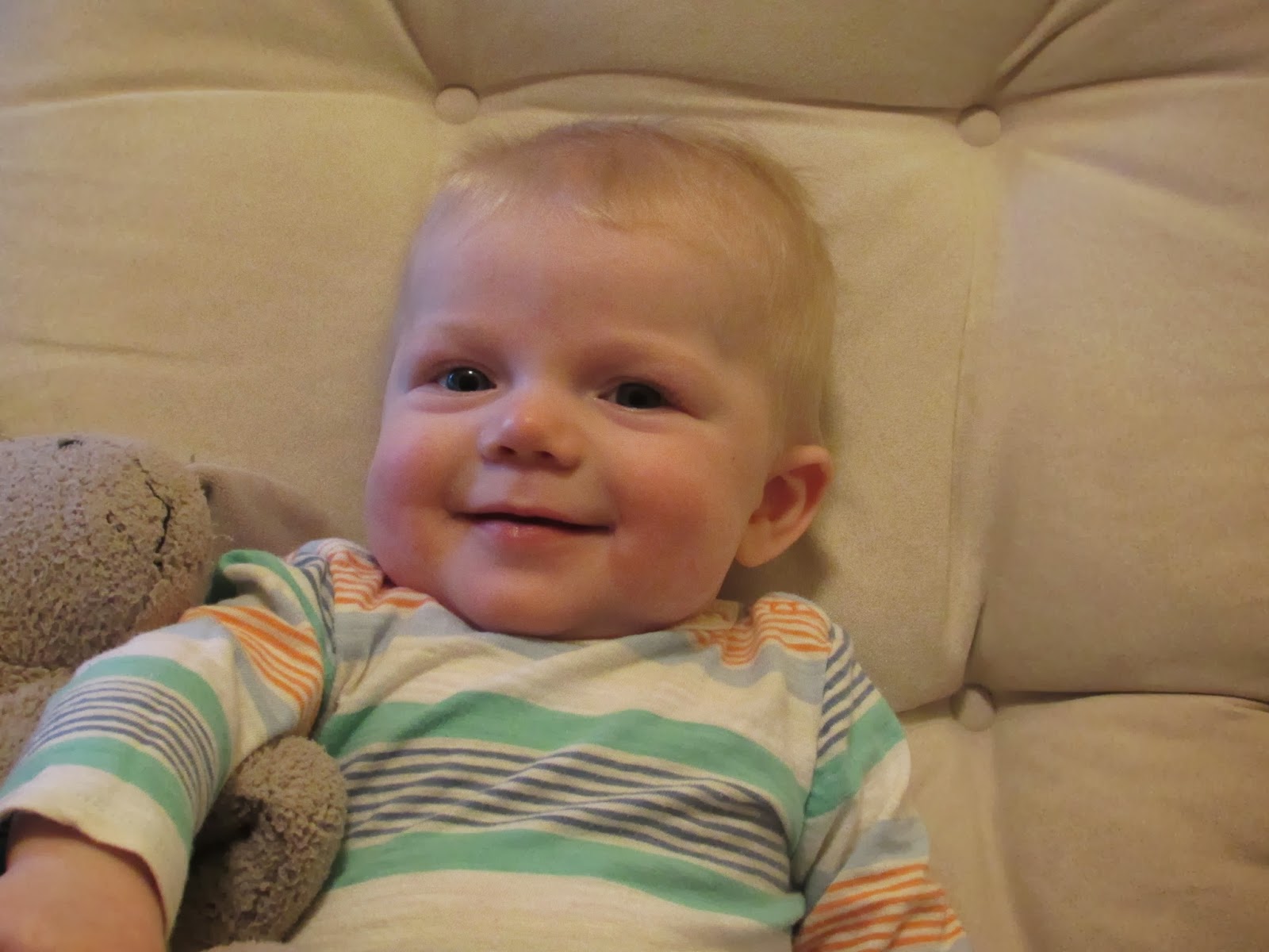 Your sleeping at night is still pretty much the same. You go to bed between 7:00-7:30pm and wake up for the first time between 10:30-11:30pm. You get a bottle and I change your diaper then it’s back to bed until you wake up again anywhere from 1:00-3:00am. You’re usually up for the day between 7-7:30am. I’ve considered trying the Cry It Out Method, but I’m not quite ready to do that yet. One thing that has gotten better this month is nap time! You now have pretty consistent nap times with the first nap at 10:00am and the second one at 2:00pm. Sometimes you’ll take a little power nap around 4:30pm, but we don’t let you sleep past 5:00pm. You’re also napping better in your crib instead of requiring that someone holds you.