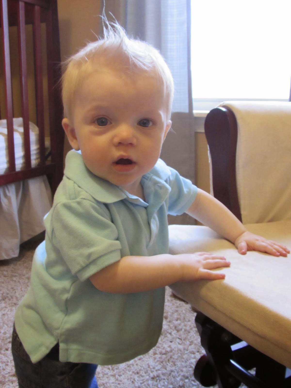 Let’s start with all your big milestones. You are pulling up on everything including our legs if we’re standing still. You can also stand without holding onto anything for several seconds at a time. Your biggest achievement this month though is that you are walking behind your lion push toy. You just crawl on over to it, pull yourself up, and take off walking and pushing that thing around. You’re no longer army crawling and instead take off at lightening speed on all fours.