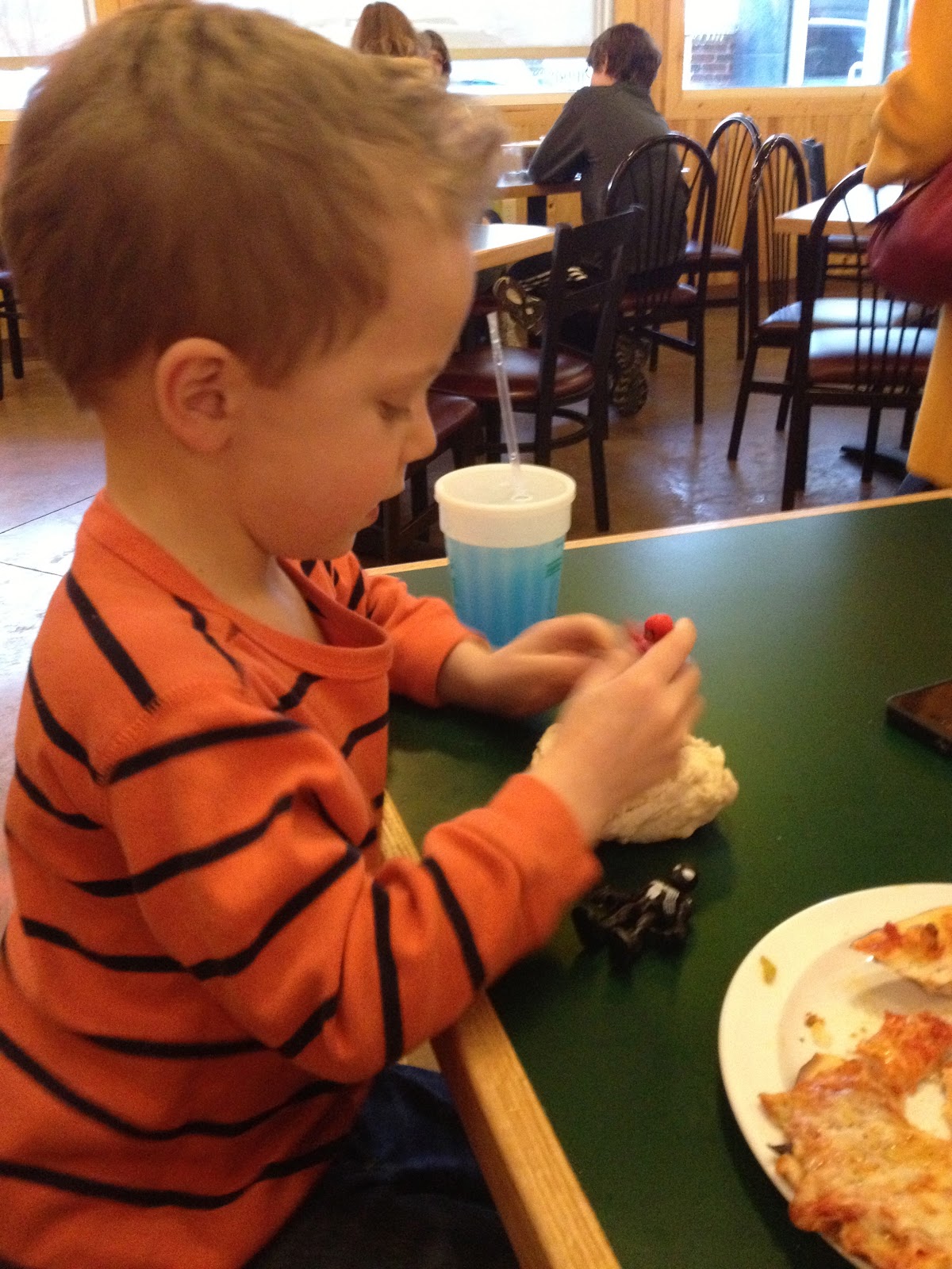 This past Sunday we wrapped up the weekend with dinner at one of our favorite pizza places. Ben loves this place because they give the kids a ball of dough to play with while you wait for your pizza.