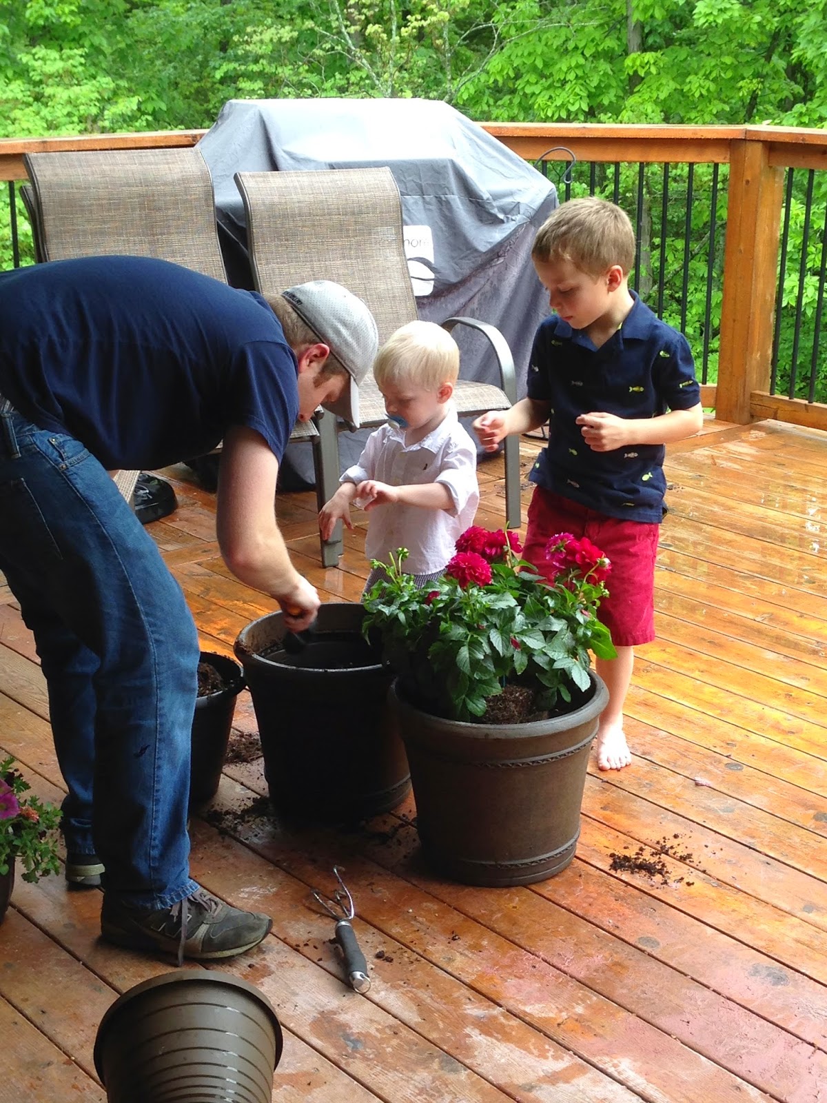 When the rain finally stopped, the boys continued with their Mother’s Day tradition of planting new flowers in the flower pots.