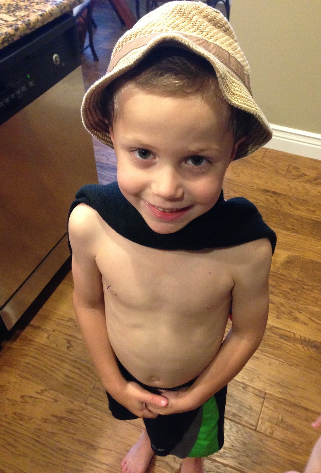 This boy cracks me up. Some of the things he says and does have me laughing so hard. He did a little wardrobe change while I was making dinner and this was his new outfit.