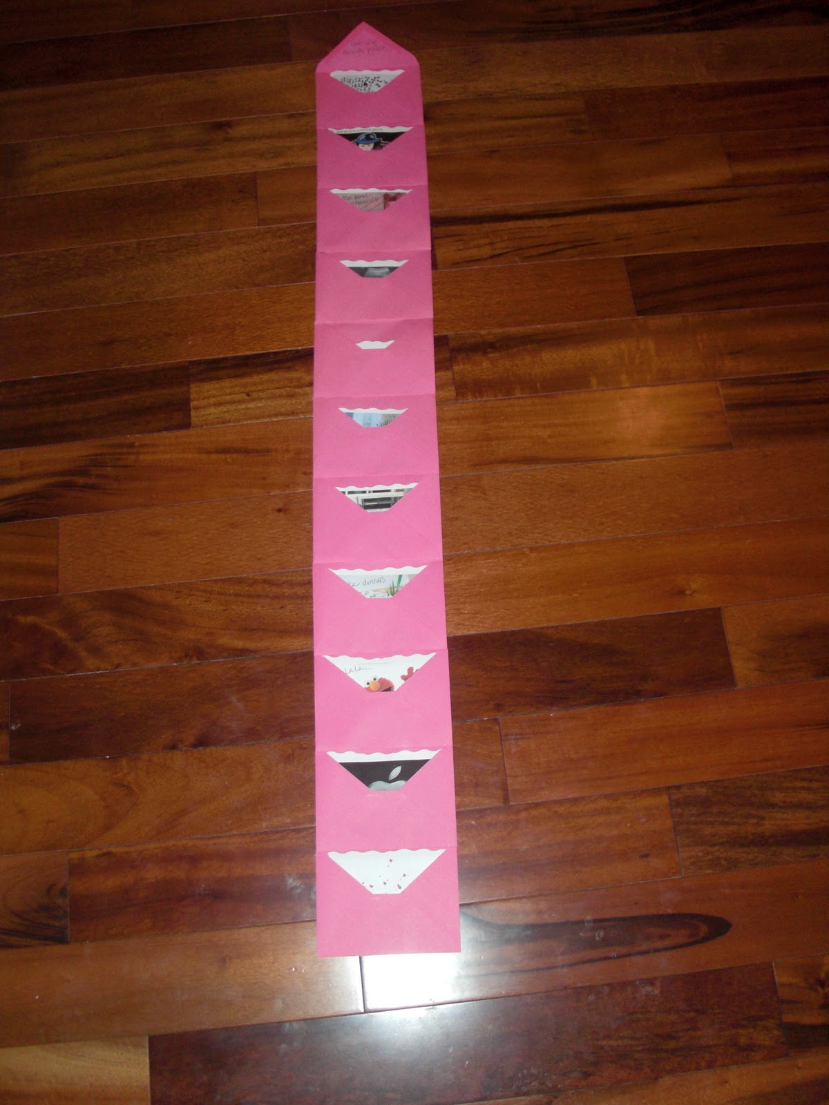 The idea came from an issue of Martha Stewart Living magazine.You simply glue each envelope to the one above it and then in each slot you put a little something. I decided to do pictures representing our life over the past 4 years. You could also do gift cards, movie ticket stubs, concert tickets, etc.