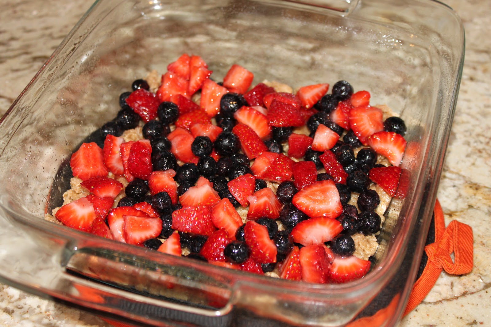 4. To avoid a soggy crust, I divided the “crisp” mixture in half and placed half of the mixture in the bottom of the pan. Bake it for approximately 10 minutes at 350 degrees. After 10 minutes, remove the pan from the oven and add the berry/sugar mixture over the bottom layer of crisp.