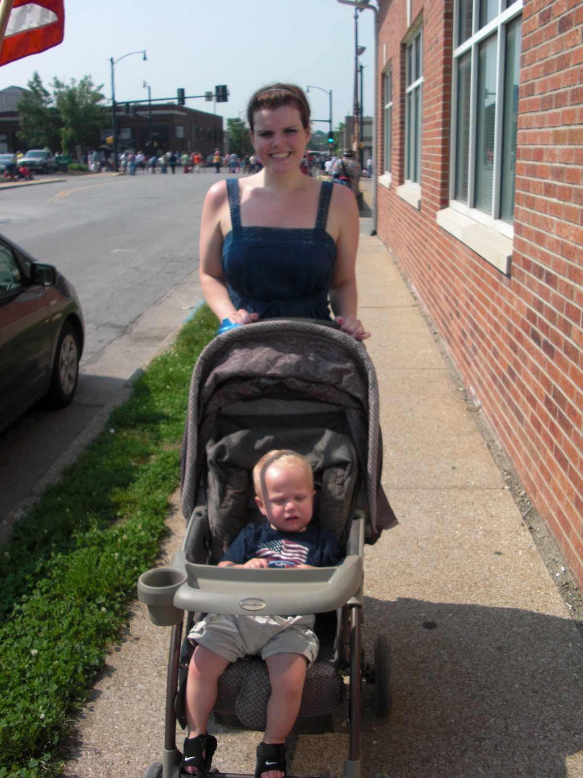 On Monday Ben and I got ready in a hurry and my mom picked us up to take us to the parade downtown. It was supposed to start at 9:55 but by 10:30 there was still no parade and Ben was getting restless, crabby, and hot. We did get to see the parachuters jump from the plane, but after that we decided to just go ahead and go.