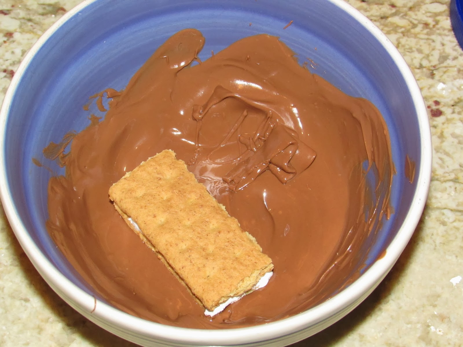 5. Dip one side of the graham cracker sandwich into the chocolate and shake of any excess.