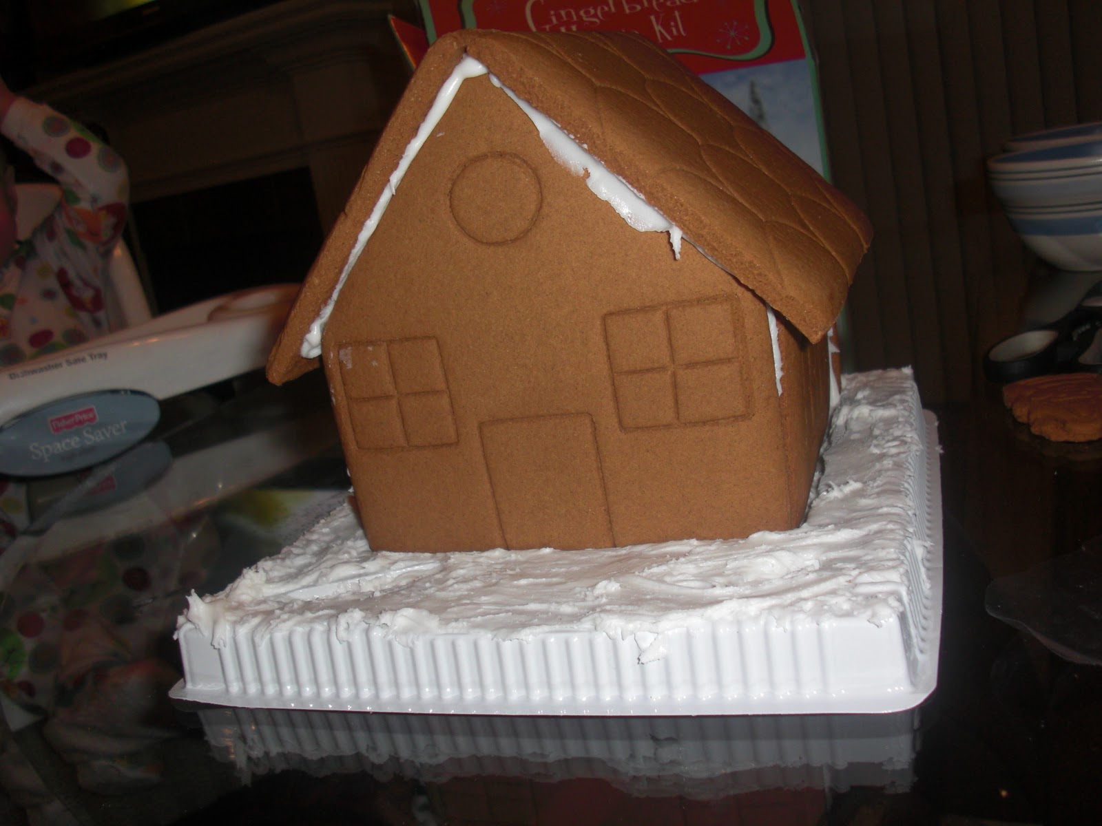 Last week at Target I picked up a kit to make a gingerbread house. I’ve only attempted this once in the past and halfway through when the roof fell in for the fifth time I gave up. I was willing to give it another try and with J having an engineering degree and all I figured between the two of us we could figure it out.