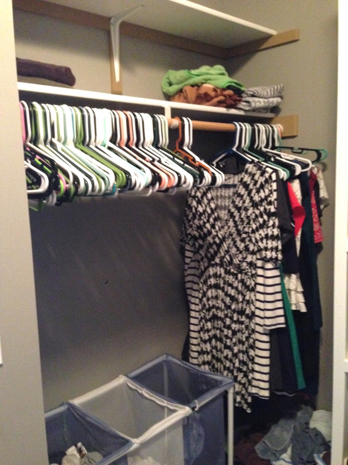 Looking left into our closet across from J’s side. Extra hangers, dirty clothes hampers, and all my dresses. Towels normally go on the shelf but as you can see I really needed to do laundry. I wish the painters had painted the reinforcing boards as well and we may go back through at some point and paint them gray as well. May.