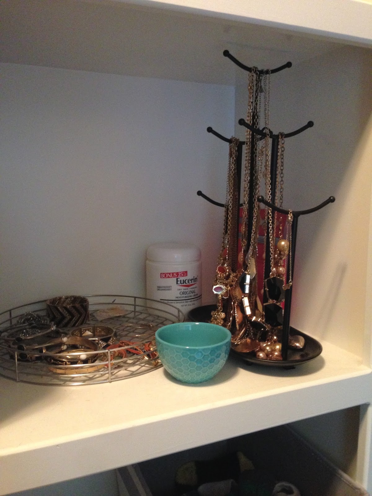 I keep my necklaces on that necklace tree, bracelets/watches on the circular tray, and then stud type earrings in the blue dish I picked up at West Elm. All my other earrings are stored in a hanging jewelry holder with pockets which you can see in the last pic on the far right.