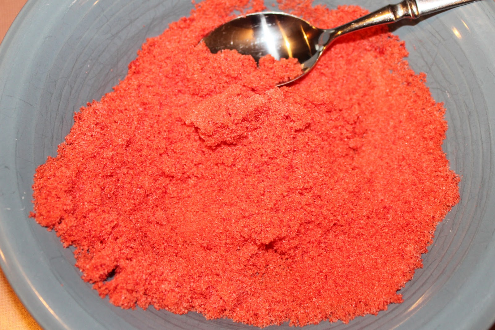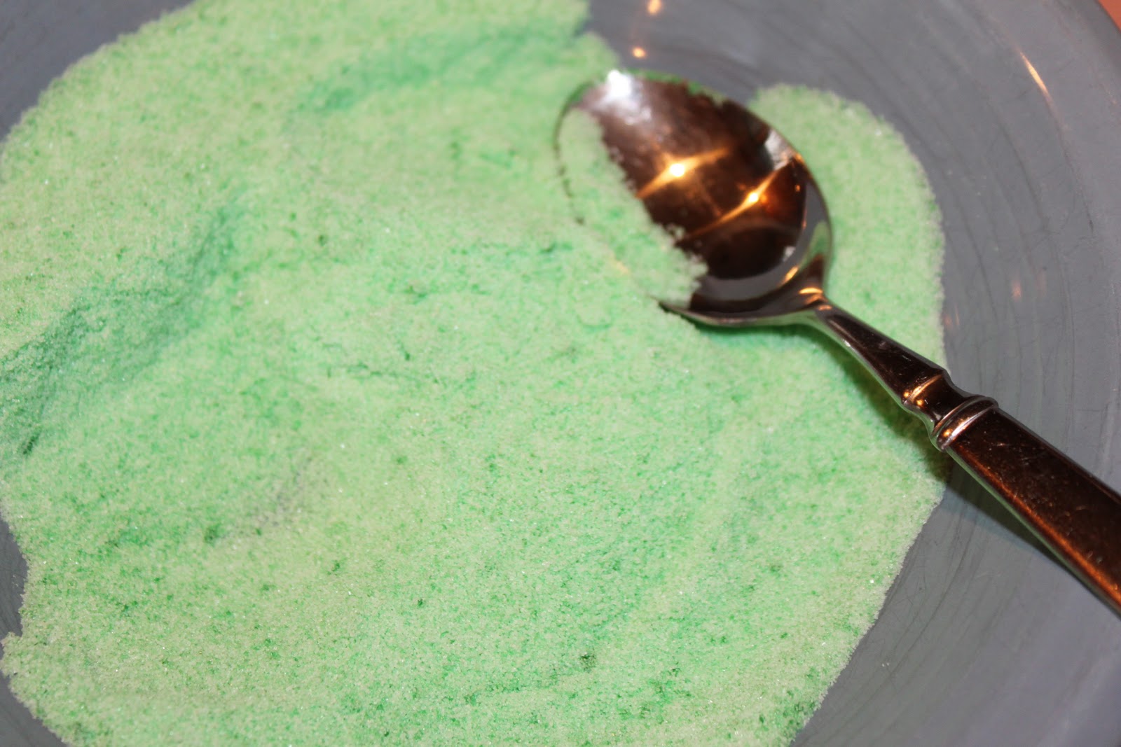 5. Set the dough aside and make the colored sugar. You can buy colored sugar at the store, but mine didn’t have any so I just whipped up my own. I took plain granulated sugar and added a few drops of food coloring.