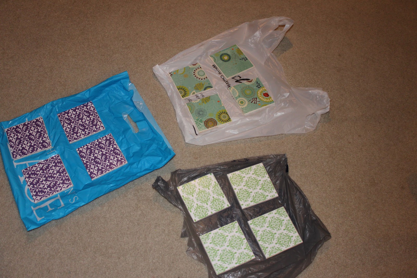5. I repeated the steps above with 3 different patterns of paper. When the Mod Podge is dry, spray a coat of the clear glaze. I put the tiles on store bags to make it easier to move them outside to spray.