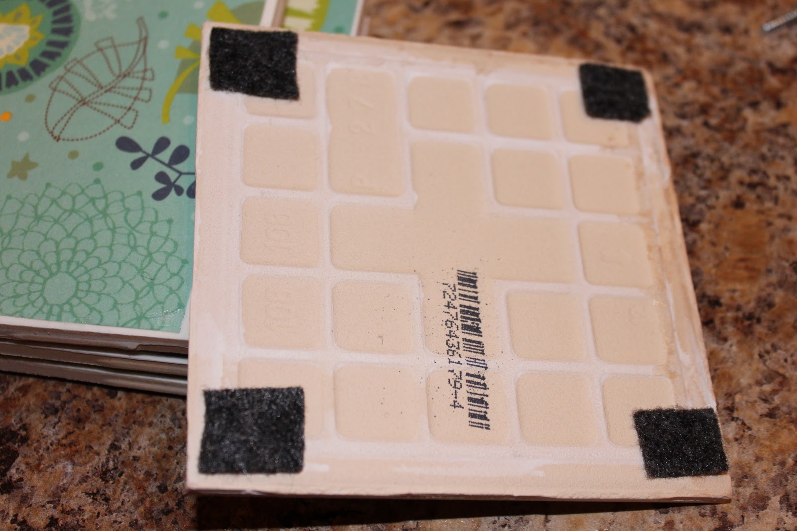 6. Cut felt squares and hot glue to the corner of the tiles. You can also buy pre-cut felt circles but I couldn’t find any at my store.