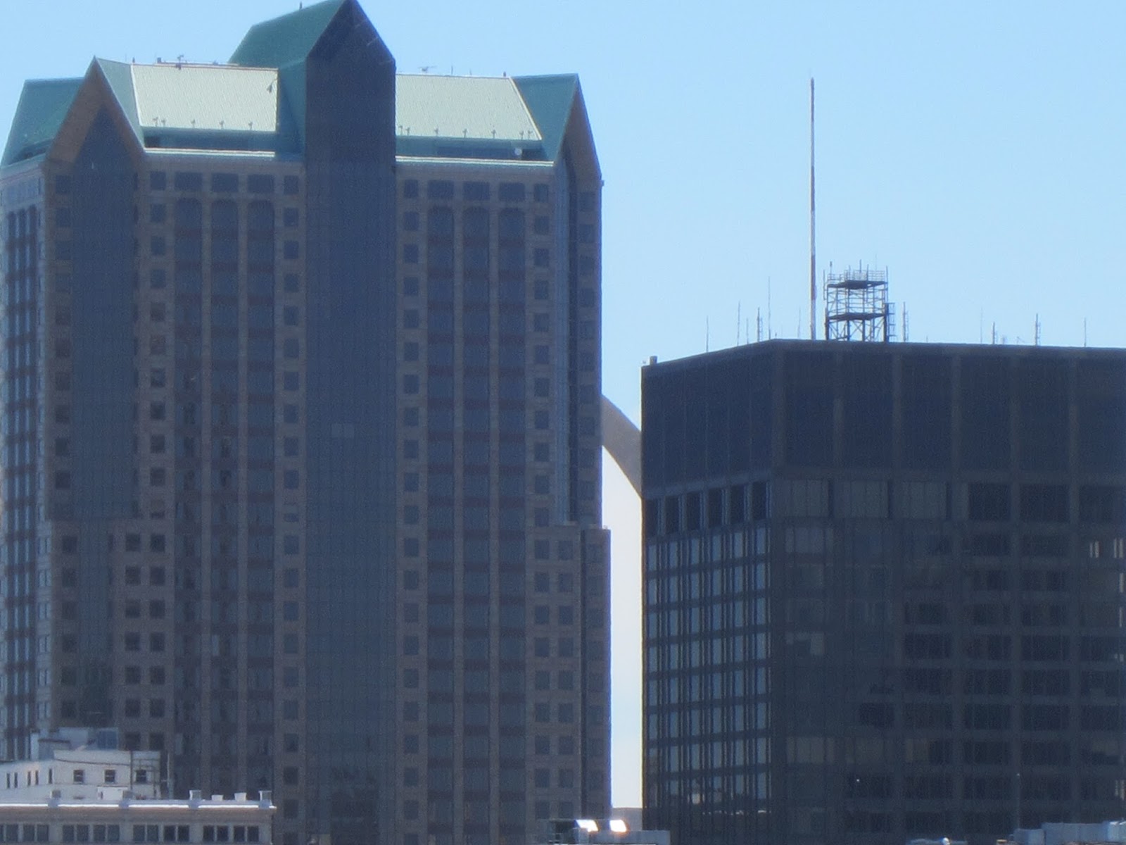 The arch peeking through the buildings.