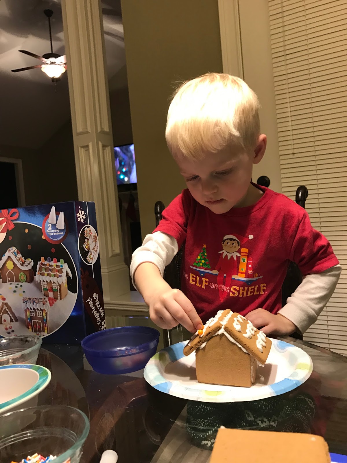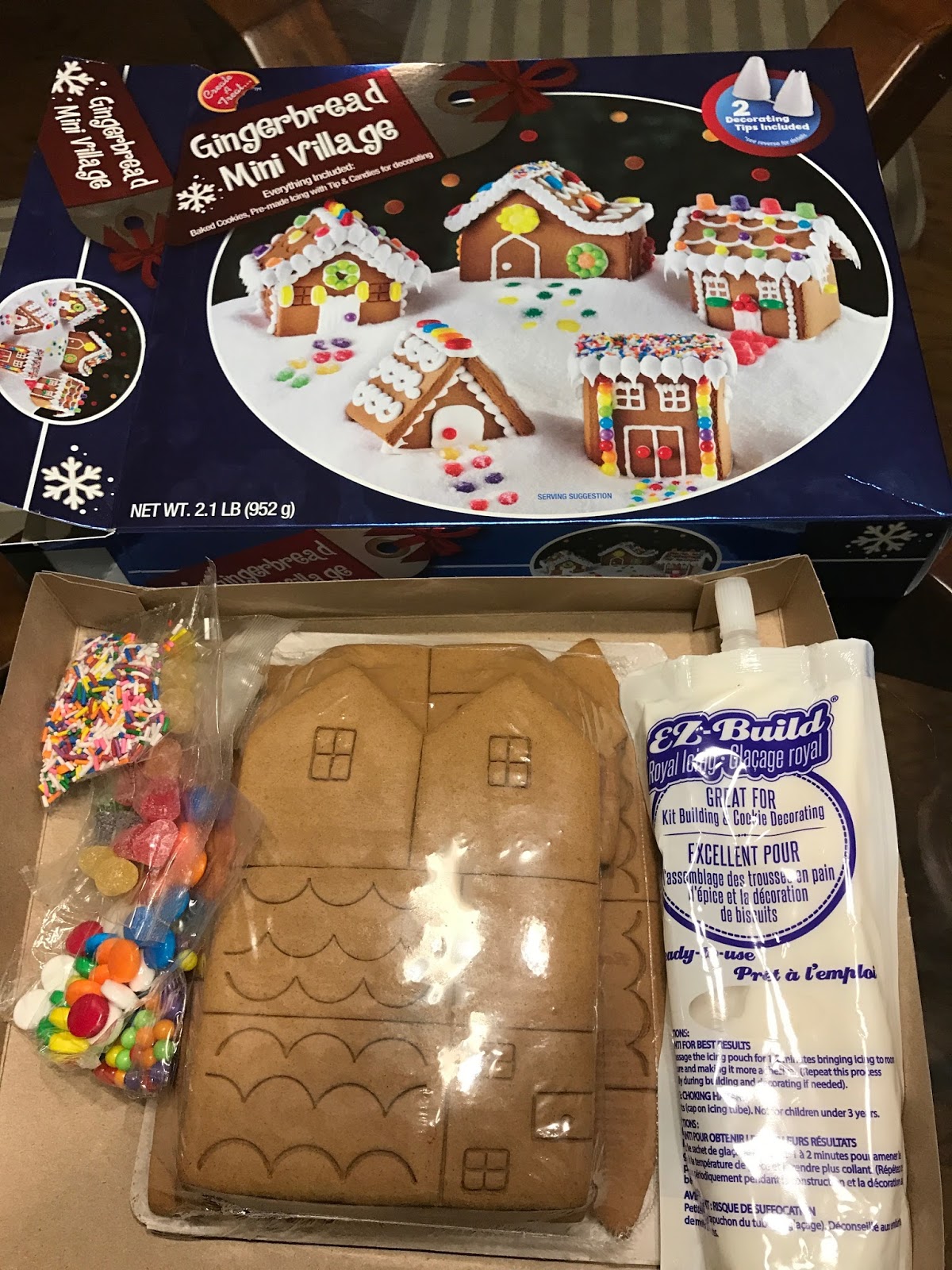 Our Friday night was wild and crazy building a Gingerbread village. I’ve wised up over the years and now buy the village so everyone has their own house decorate which cuts down on the fighting. I normally get our kits from Walmart or Target but I picked up this one from Bed Bath & Beyond while buying some presents and it’s the best kit we’ve had yet. Super easy to assemble, the icing actually held the houses together, and it tasted like Pillsbury frosting.